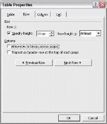 Now go back to ?Table Properties? and click on ?Row?.? Check ?Specify height? and make it 11cm with ?Row height? set to ?At least?.?? Make sure that nothing else is checked.? Click on OK
