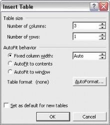 Change the ?Number of columns? to 3 and the ?Number of rows? to 1.? If you want to you can check ?Set as default for new tables?.? Useful if you intend making several different sizes of template and don?t use this facility for anything else.? Click OK